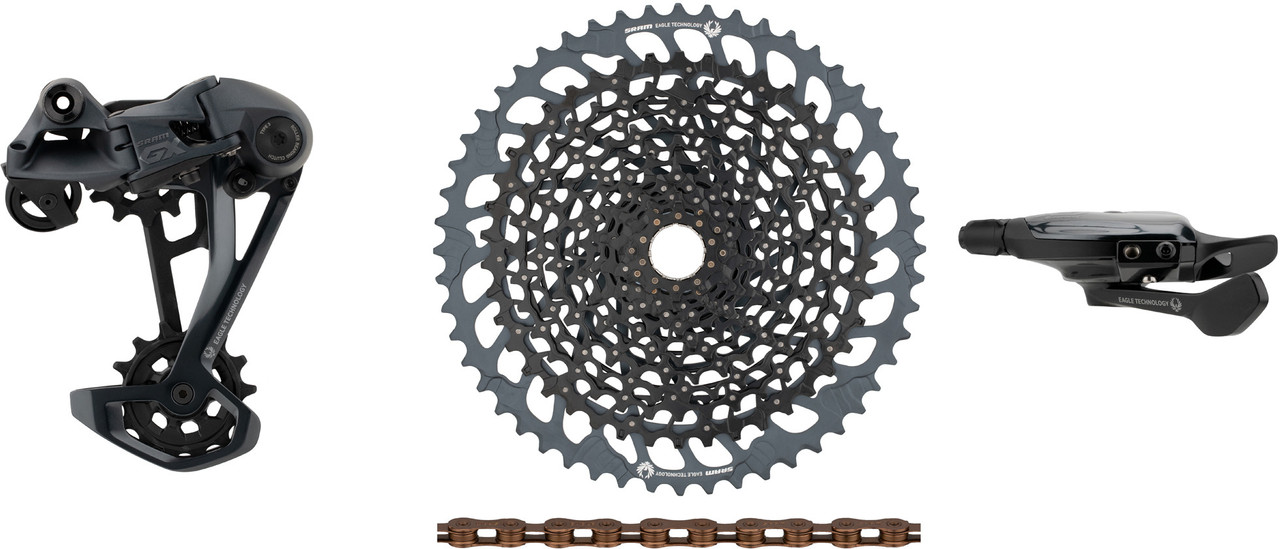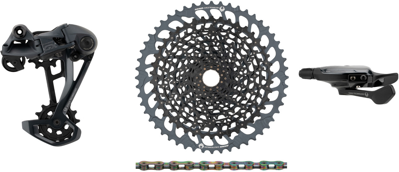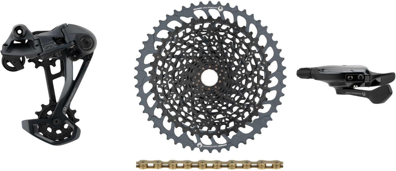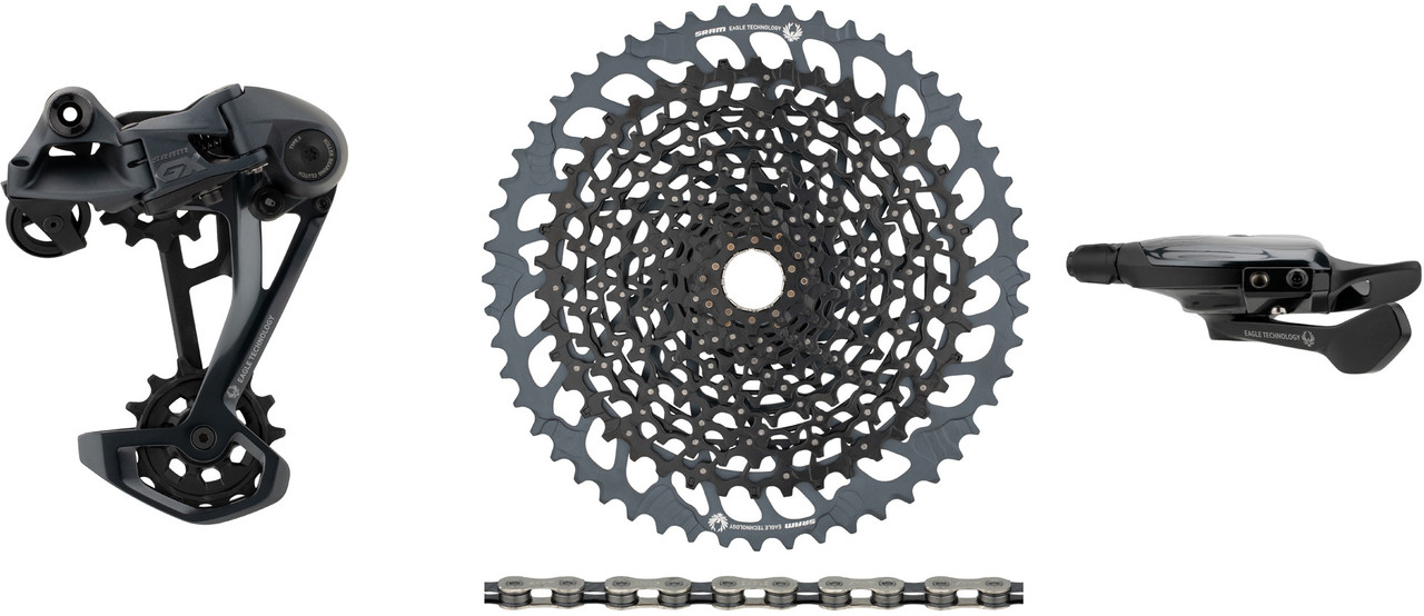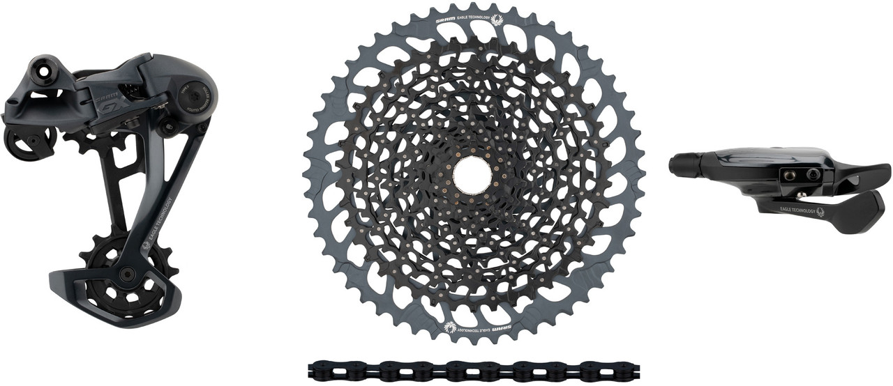 Dieses SRAM Upgrade-Kit der Serie GX Eagle für 1×12-fach-Antriebe hat die passende Kassette direkt dabei. Es setzt sich zusammen aus dem neuesten GX Eagle Schaltwerk, passendem GX Eagle Trigger Schaltgriff, einer XG-1275 Kassette sowie einer PC XX1 Eagle oder PC GX Eagle Kette.